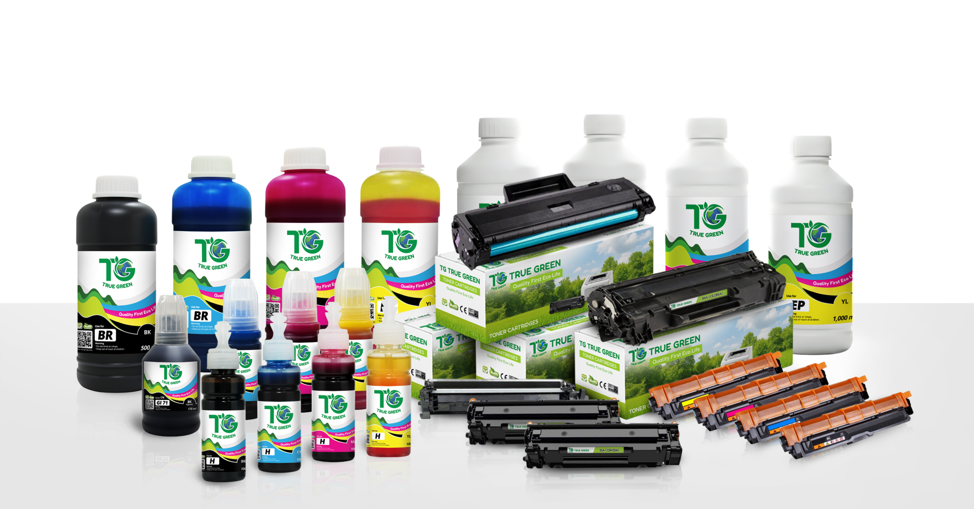 เราทำงานร่วมกับผู้ผลิตที่ได้รับความไว้วางใจ เพื่อคัดสรรหมึกพิมพ์และตลับหมึกคุณภาพพรี่เมียมภายใต้แบรนด์ TG True Green ทุกผลิตภัณฑ์ได้รับการออกแบบมาเพื่อให้สีสันสดใส ตัวอักษรคมชัด พร้อมช่วยถนอมอายุการใช้งานของเครื่องพิมพ์ของคุณ เรามุ่งมั่นนำเสนอโซลูชั่นที่หลากหลาย เพื่อช่วยลดต้นทุนการพิมพ์ได้สูงสุดถึง 70% โดยไม่ลดทอนคุณภาพระดับมืออาชีพ