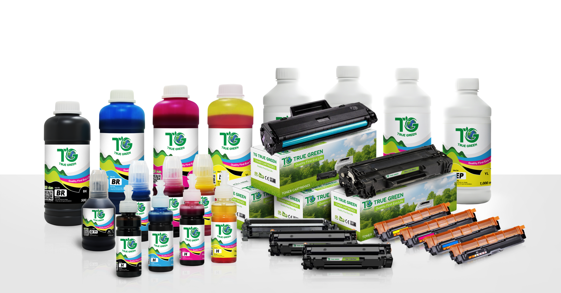 เราทำงานร่วมกับผู้ผลิตที่ได้รับความไว้วางใจ เพื่อคัดสรรหมึกพิมพ์และตลับหมึกคุณภาพพรี่เมียมภายใต้แบรนด์ TG True Green ทุกผลิตภัณฑ์ได้รับการออกแบบมาเพื่อให้สีสันสดใส ตัวอักษรคมชัด พร้อมช่วยถนอมอายุการใช้งานของเครื่องพิมพ์ของคุณ เรามุ่งมั่นนำเสนอโซลูชั่นที่หลากหลาย เพื่อช่วยลดต้นทุนการพิมพ์ได้สูงสุดถึง 70% โดยไม่ลดทอนคุณภาพระดับมืออาชีพ